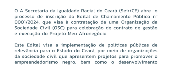 O Governo do Ceará, por meio da Secretaria da Igualdade Racial (Seir), divulga, nesta quarta-feira (22), o resultado preliminar de classificação das instituições inscritas no Edital de Chamamento Público nº 0001/2025, destinado à celebração de termos de colaboração com foco nos povos quilombolas.